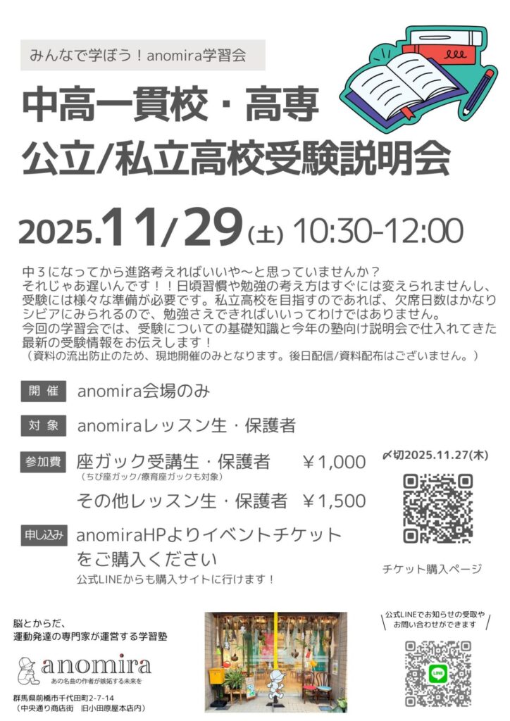 anomira受講生・保護者ページと一般の方の購入ページが一緒になりました。各イベントの詳細をご覧になってからご購入ください。